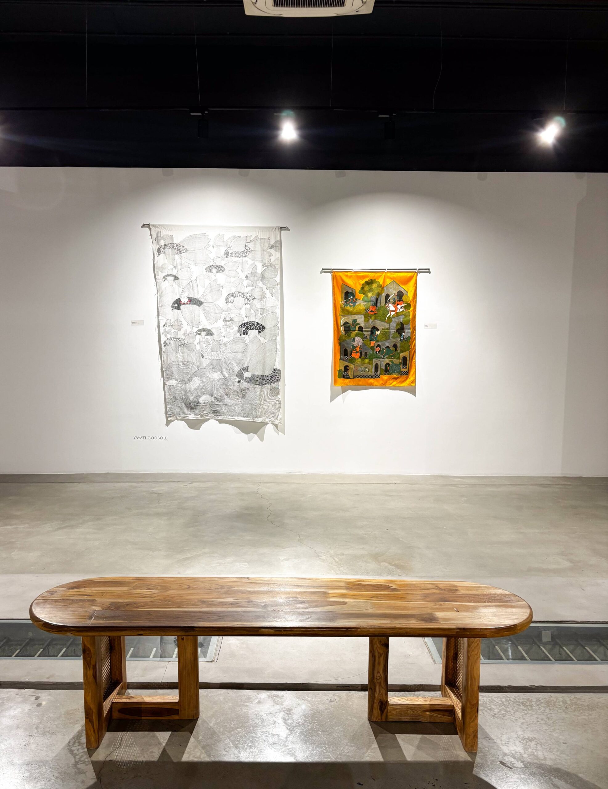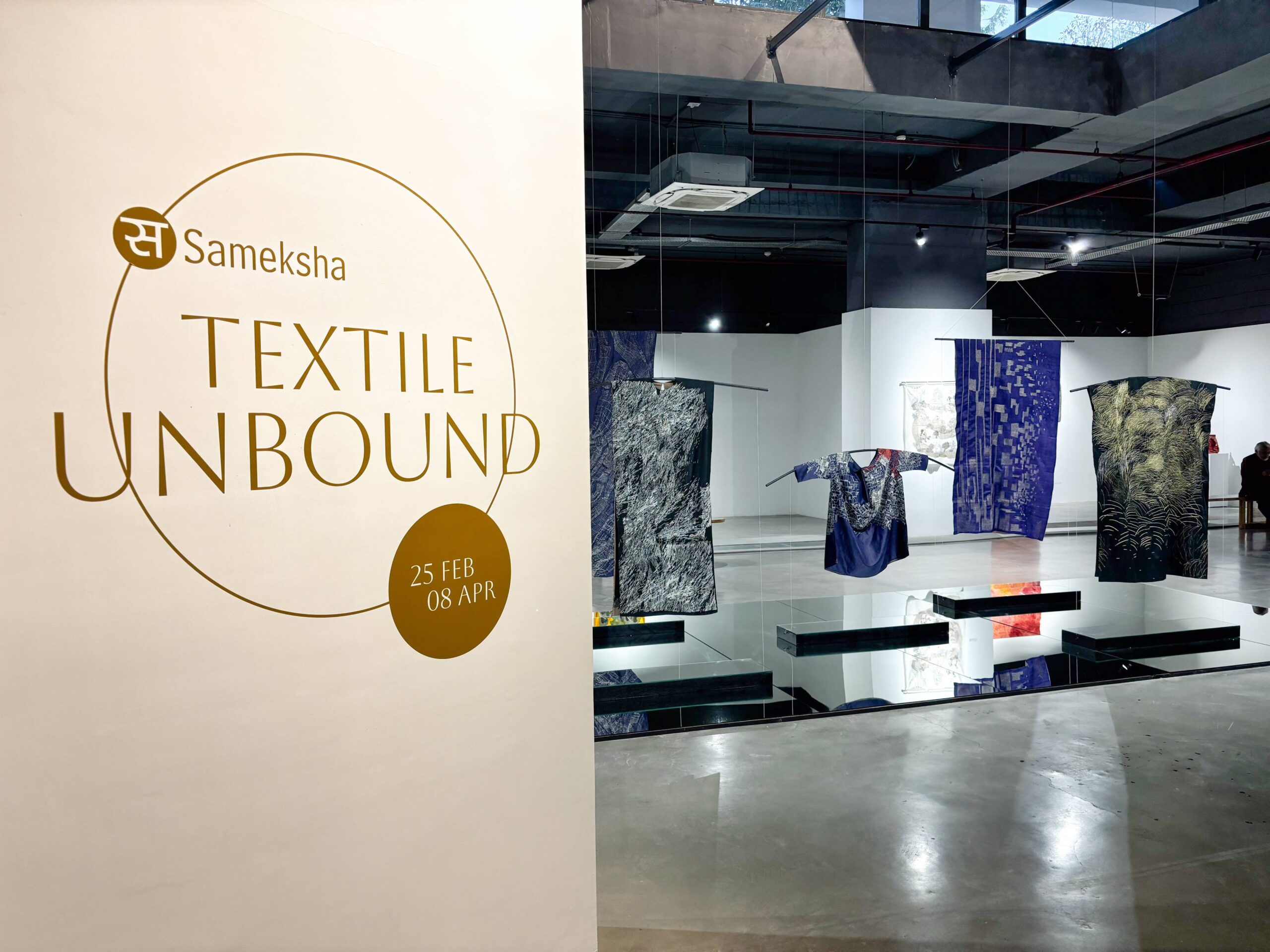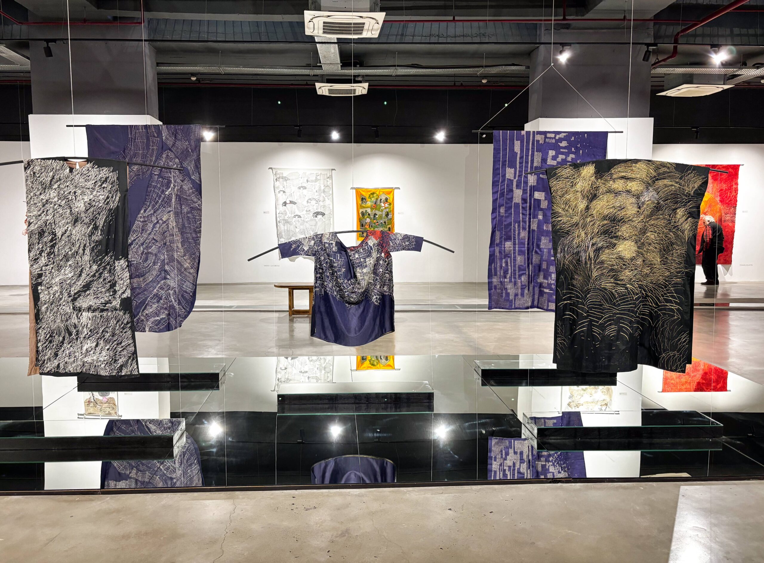 Textiles Unbound showcases six such trailblazers. Swati Kalsi disrupts silk’s finesse in five daring surface experiments, igniting form and color. Pragati Mathur forges copper weaves into an abstract Acacia seed provocation. Tinkal Khatri shatters dyeing’s limits with immersive, controversial depths creating sculptural pieces. Yayati unleashes fluid black lines on patchwork textiles, echoing embroidery’s narrative fire. Chetnaa in collaboration with Prama by Pratima Pandey transforms minimalist paintings into eclectic light-shade weaves. Heena Pari engages with patchwork layers; rhythmic, recycled abstractions pulsing with heritage and heresy.